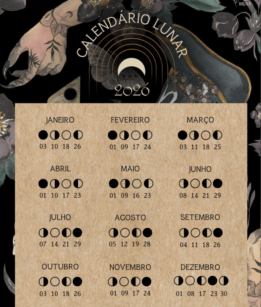 Pra você acompanhar as fases da lua ao longo do ano de 2026 e planejar seus feitiços e rituais.